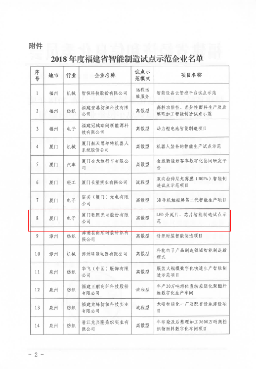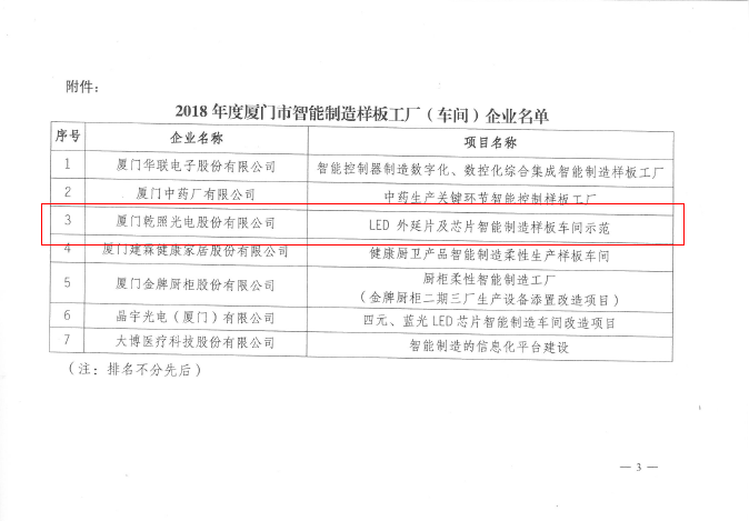 2018年,乾照光電在紅黃光領(lǐng)域,堅(jiān)持“擴(kuò)產(chǎn)+擴(kuò)充高端產(chǎn)品”的發(fā)展戰(zhàn)略;在藍(lán)綠光領(lǐng)域,實(shí)施“全面擴(kuò)產(chǎn),規(guī)模跟隨”的布局戰(zhàn)略,爭(zhēng)取做行業(yè)龍頭。通過自身努力獲得了行業(yè)的廣泛認(rèn)可。2018年,乾照光電的LED外延片及芯片智能制造項(xiàng)目更是榮獲國(guó)家工信部智能制造試點(diǎn)示范項(xiàng)目、福建省經(jīng)信委智能制造試點(diǎn)示范項(xiàng)目、廈門市智能制造樣板工廠(車間)示范等一系列榮譽(yù)。