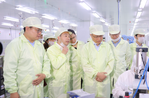 6月3日,南昌市委常委、常務(wù)副市長(zhǎng)肖玉文,市政府副秘書(shū)長(zhǎng)、辦公廳主任王耀,新建區(qū)政府、市金融辦、市工信局、市工業(yè)控股主要領(lǐng)導(dǎo),以及中國(guó)銀行南昌分行、中國(guó)建設(shè)銀行南昌分行、中國(guó)農(nóng)業(yè)銀行南昌分行、北京銀行南昌分行、江西銀行南昌分行等相關(guān)負(fù)責(zé)人,蒞臨江西乾照光電調(diào)研指導(dǎo)工作。乾照光電董事長(zhǎng)金章育,副總裁嚴(yán)希闊,江西乾照光電總經(jīng)理劉兆等陪同接待。