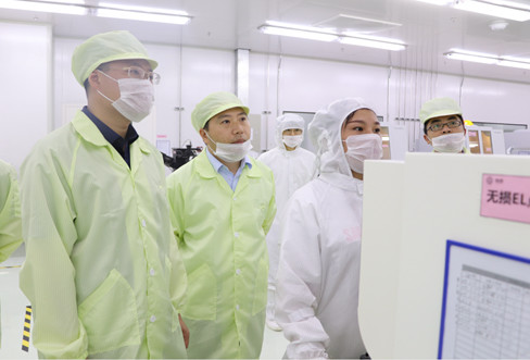 隨后,考察組一行參觀了生產(chǎn)車間,重點觀摩了芯片工藝流程和點測工藝,對現(xiàn)代化的生產(chǎn)技術(shù)頻頻稱贊。得知外延生產(chǎn)車間中運作良好的MOCVD設(shè)備均為南昌當(dāng)?shù)仄髽I(yè)生產(chǎn)制造時,盛煒書記對乾照光電對南昌光電產(chǎn)業(yè)發(fā)展的支持表示了贊許。