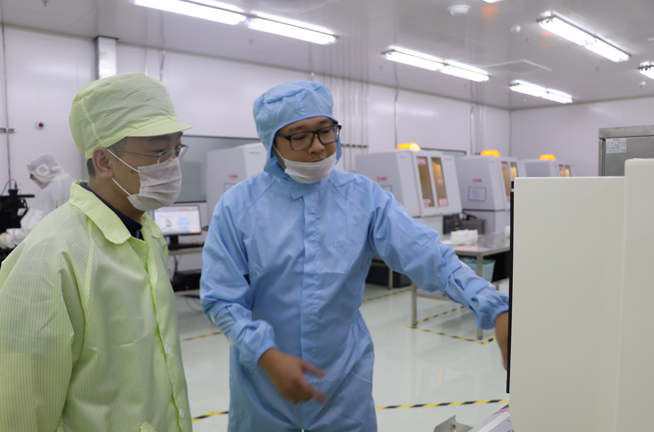 在展廳,調(diào)研組一行認(rèn)真聽取了陳文戎對廠區(qū)總體規(guī)劃布局、基地項目進(jìn)度、主要生產(chǎn)產(chǎn)品以及應(yīng)用領(lǐng)域的介紹。副局長金偉對“乾照速度”頻頻稱贊,并給予了“快建快投產(chǎn),真心干實(shí)業(yè)”的高度評價。來到生產(chǎn)車間,調(diào)研組一行觀看了外延片的生產(chǎn)流程,同時針對檢測方式進(jìn)行了探討與交流。