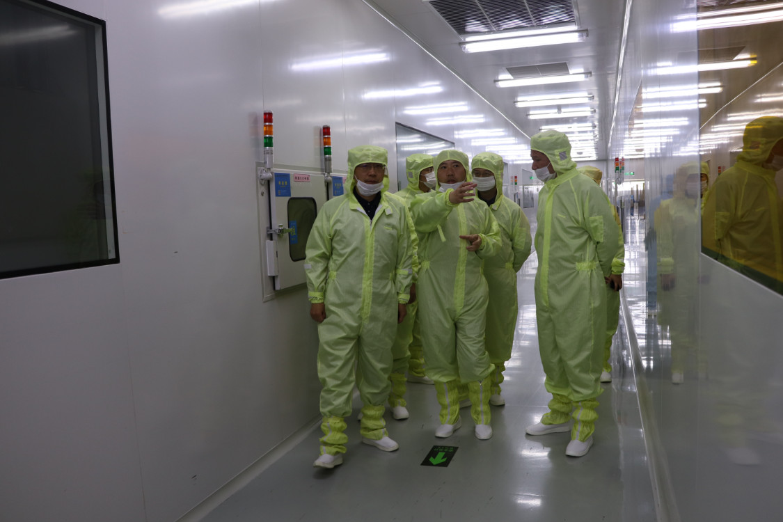 李廳長一行前往芯片蒸鍍、清洗、黃光站、點測站等生產(chǎn)車間進行了參觀。劉兆引導(dǎo)大家觀看了車間內(nèi)生產(chǎn)設(shè)備的操作情況,對芯片的生產(chǎn)制作流程進行了講解。李廳長認(rèn)真觀摩了產(chǎn)線的各個環(huán)節(jié),對企業(yè)現(xiàn)代化的生產(chǎn)技術(shù)和設(shè)備的運作程序表示高度贊賞。同時還認(rèn)真聽取了劉兆對公司目前發(fā)展情況的詳細匯報,對江西乾照光電目前的發(fā)展態(tài)勢給予了肯定。