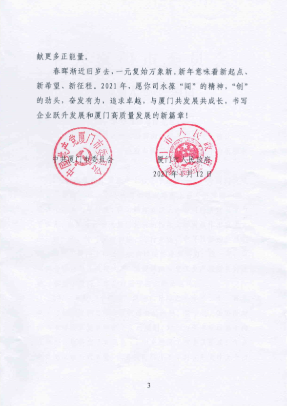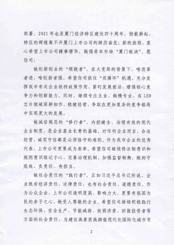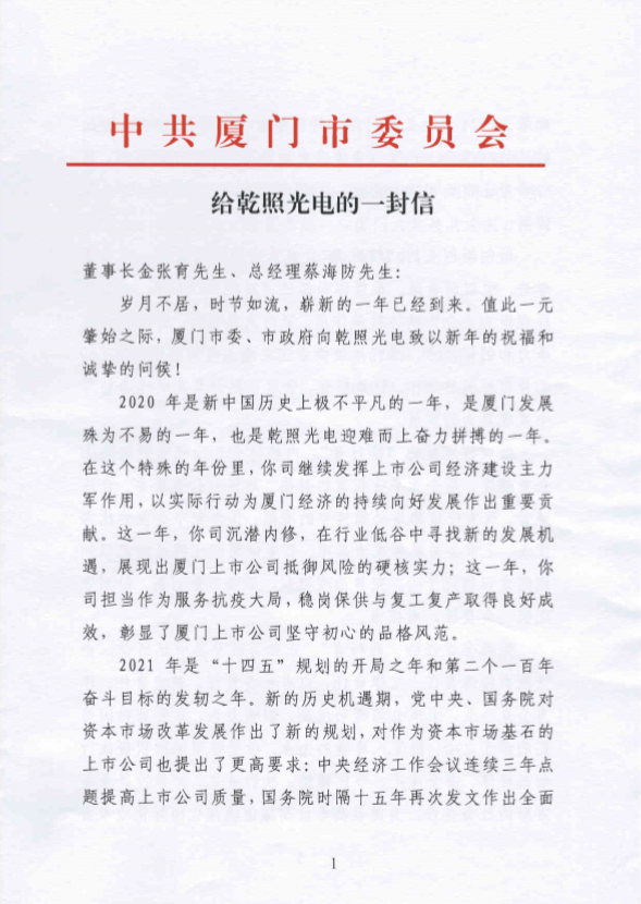 近日,乾照光電收到中共廈門市委員會的來信,信中廈門市委、市政府對于我司過去一年的發(fā)展給予了積極的評價,并在一元肇始之際,對我司表達了新年的祝福和誠摯的問候,同時就我司2021年的發(fā)展規(guī)劃做出重要指引。