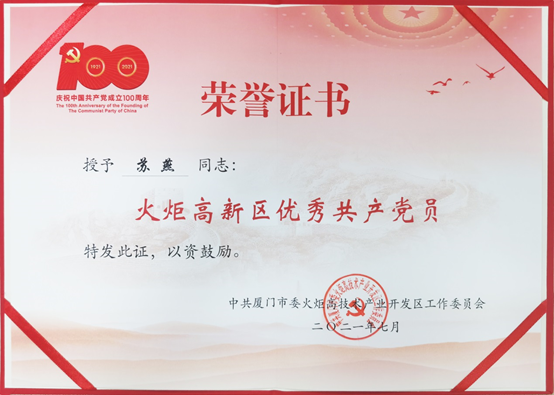 廈門乾照光電蘇燕榮獲“火炬高新區(qū)優(yōu)秀共產(chǎn)黨員”稱號