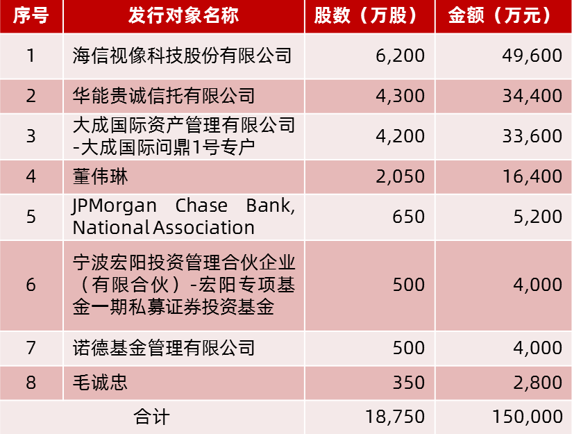 本次發(fā)行對象最終確定為8家,發(fā)行配售結(jié)果如下: