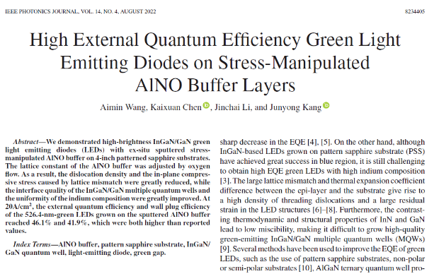 8月份,廈門大學(xué)物理科學(xué)與技術(shù)學(xué)院與乾照光電協(xié)同攻關(guān),在提升綠光LED效率方面取得重大進展。該研究成果以“High External Quantum Efficiency Green Light Emitting Diodes onStress-Manipulated AlNO Buffer Layers”為題發(fā)表于IEEE PHOTonICSJOURNAL 14(4) (2022) 8234405。廈門大學(xué)康俊勇教授與乾照光電陳凱軒博士團隊經(jīng)過3年的聯(lián)合攻關(guān),提出通過并入高濃度氧形成AlNO緩沖層的方法,降低圖形化藍寶石襯底與GaN外延層間晶格失配導(dǎo)致的應(yīng)力與缺陷,進而減緩了MQW中阱/壘的應(yīng)力及其壓電極化效應(yīng),提升了阱/壘界面的陡峭度,提高了阱中In組分的一致性,最終提高了LED的光電轉(zhuǎn)換效率。