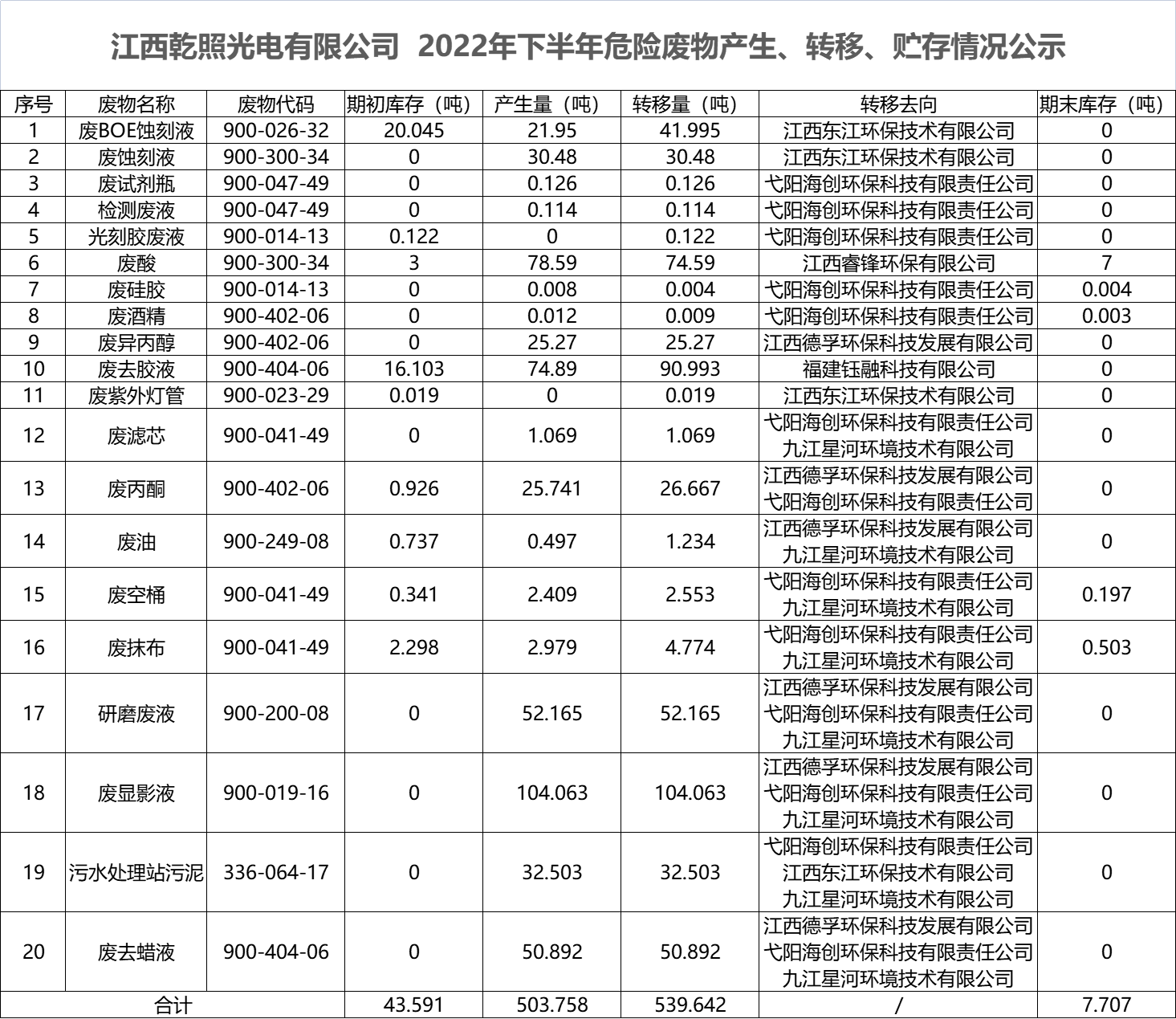 江西乾照光電有限公司2022年下半年危險廢物產(chǎn)生、轉(zhuǎn)移、貯存情況公示