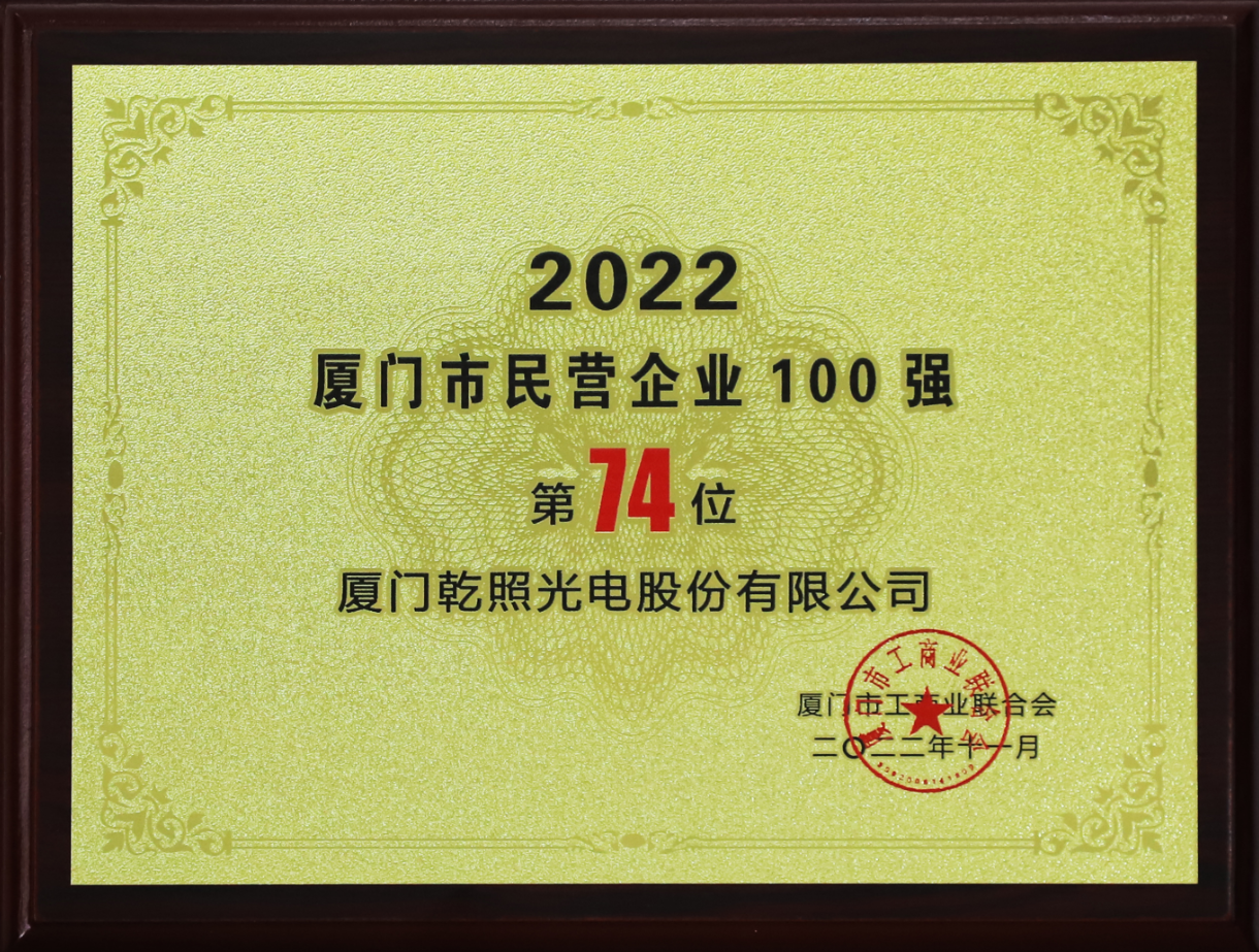 為進一步弘揚企業(yè)家精神,推動民營企業(yè)在黨的二十大精神引領(lǐng)下,開啟新征程,奮力新發(fā)展,2月17日上午,2022廈門市民營企業(yè)100強暨龍頭骨干民企授牌儀式在鷺島隆重舉行。廈門乾照光電股份有限公司榮獲 2022廈門市民營企業(yè)100強第74位、2022年度廈門市重點產(chǎn)業(yè)(半導(dǎo)體與集成電路)龍頭骨干民營企業(yè)。