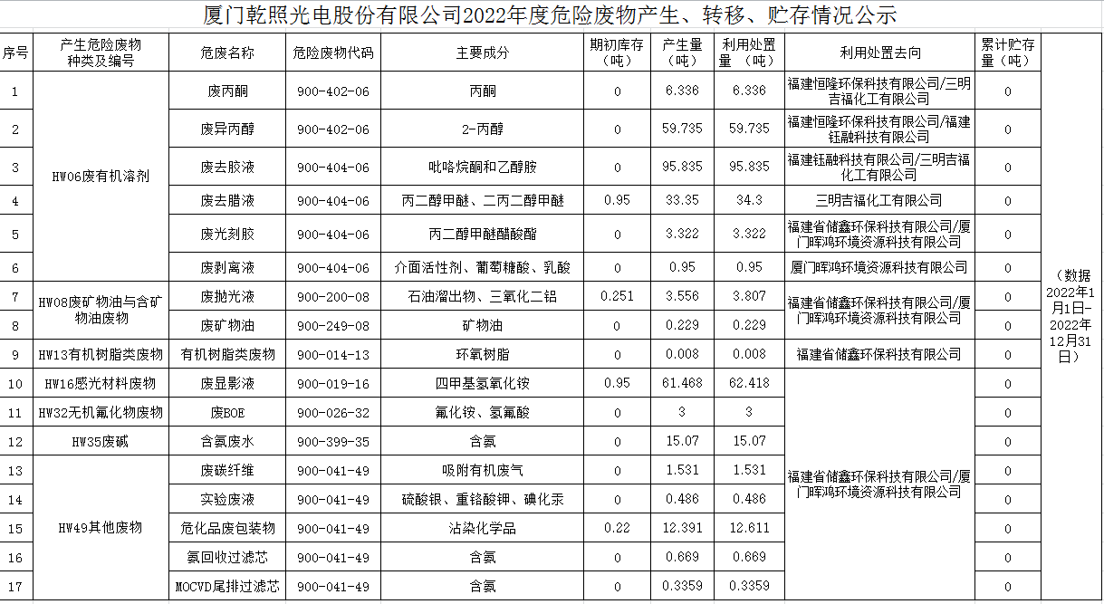 廈門乾照光電股份有限公司2022年度危險(xiǎn)廢物產(chǎn)生、轉(zhuǎn)移、貯存情況公示