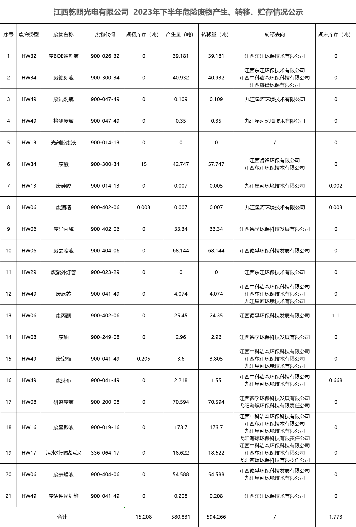 江西乾照光電有限公司 2023年下半年危險(xiǎn)廢物產(chǎn)生、轉(zhuǎn)移、貯存情況公示