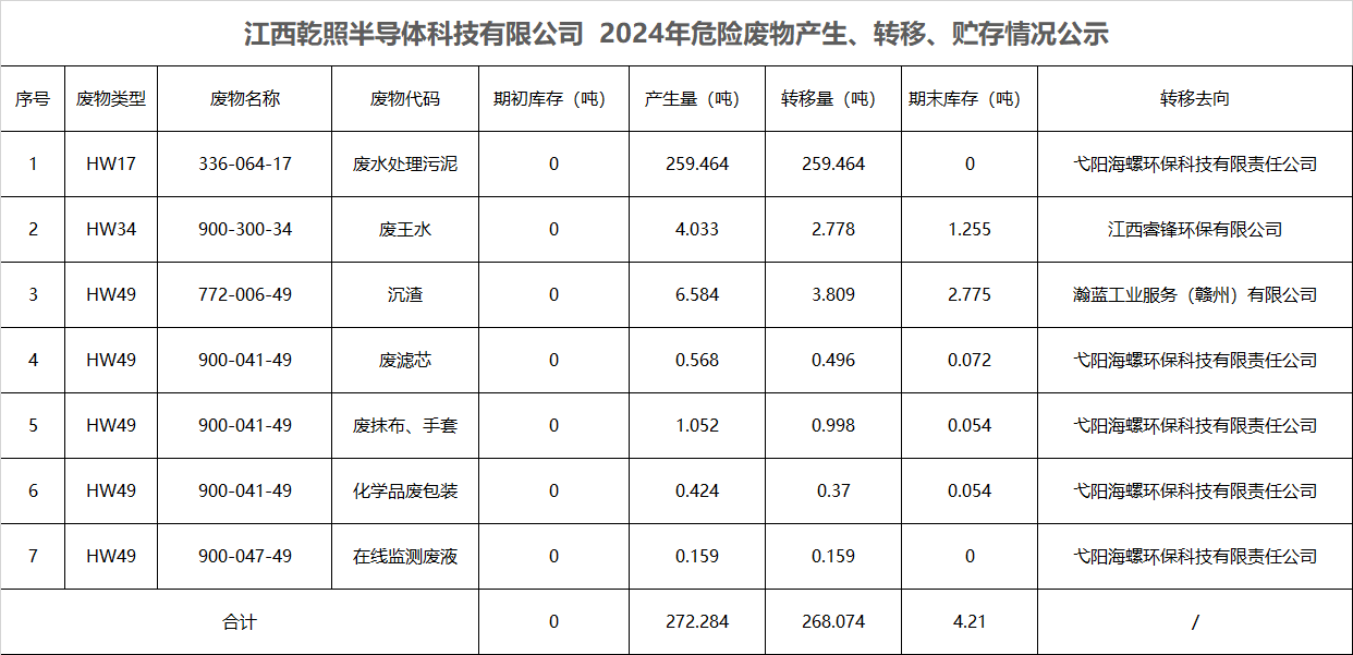 江西乾照半導體科技有限公司 2024年危險廢物產(chǎn)生、轉(zhuǎn)移、貯存情況公示