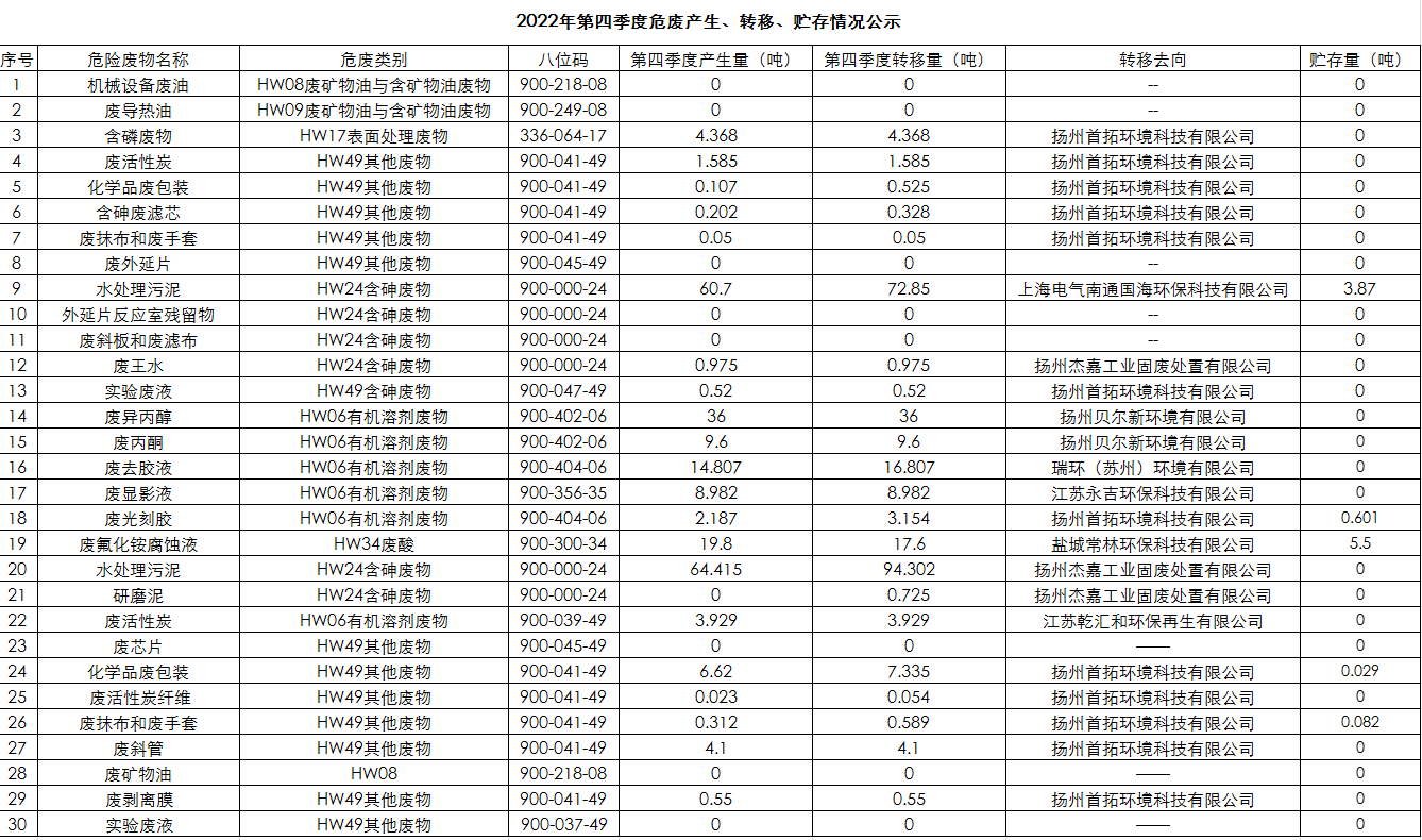 揚(yáng)州乾照光電2022年第四季度危廢產(chǎn)生、轉(zhuǎn)移、貯存情況公示