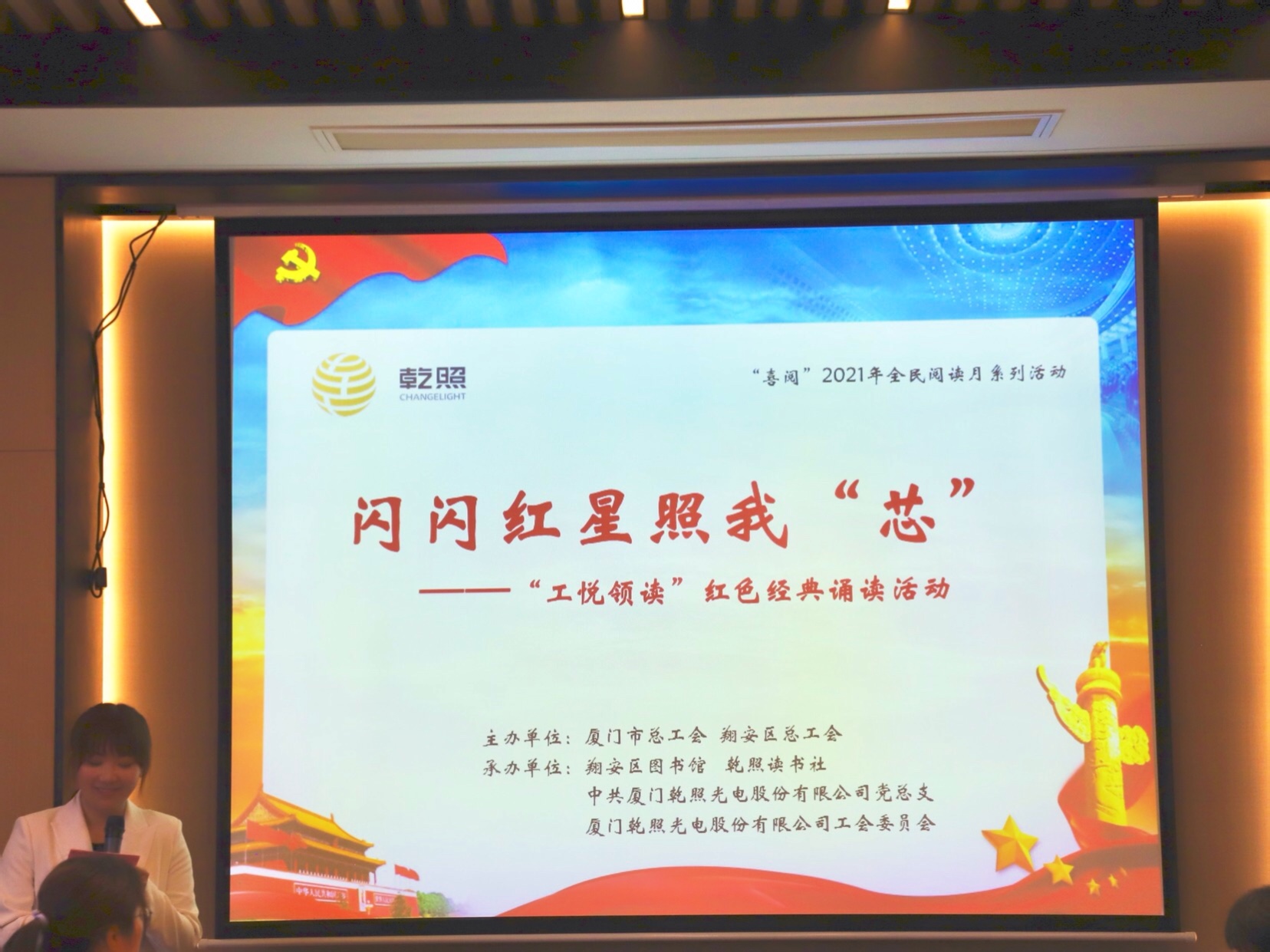 廈門市總工會宣教部部長吳紅霞蒞臨活動現(xiàn)場,乾照光電工會主席劉文輝、黨總支書記蔡建九、副總裁牛興盛以及公司部分黨員、讀書社成員出席本次活動。