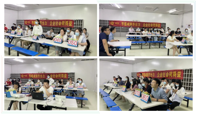 隨后,在公司培訓(xùn)室又進行了一場關(guān)于能源管理的培訓(xùn)并同步開展知識答題競賽活動。現(xiàn)場共吸引30名員工參與,經(jīng)過工作人員系統(tǒng)講解能源和環(huán)保管理等方面的相關(guān)知識后,緊張而又激烈的知識競賽就開始了!競賽中,五人一組,隨機搶答,選手們?nèi)褙炞ⅰ⒄J真思索,以昂揚的斗志、飽滿的熱情投入到比賽中。現(xiàn)場氣氛活躍,最后經(jīng)過激烈PK,六名選手獲得了本次比賽大獎!