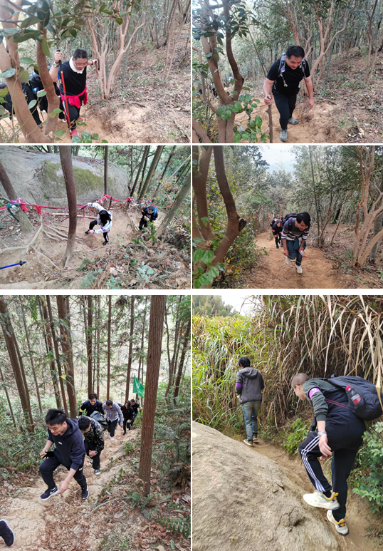 陡峭的山路,嶙峋的怪石路障,近乎垂直的崖壁……老四坡顧名思義四個坡,一個坡比一個坡險(xiǎn)峻,難度遠(yuǎn)比大家預(yù)想的艱巨。乾照精英們并沒退縮,成員間相互鼓勵,相互扶持,大家?guī)е拍畹膽?zhàn)旗,一路爬坡,一路登頂。風(fēng)聲、腳步聲、呼吸聲、加油聲,大家感受著來自團(tuán)隊(duì)的力量。中午在雷公壇匯合,短暫的就餐休整后,各參賽隊(duì)伍重回賽道,奮進(jìn)再出發(fā),最終順利完成余下的挑戰(zhàn)。