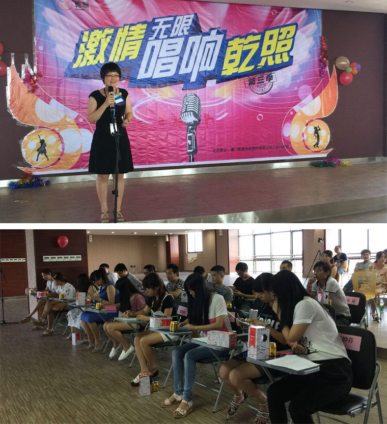 該比賽在辦公樓8樓大禮堂舉行,雖然沒有專業(yè)的場(chǎng)地,但負(fù)責(zé)此次活動(dòng)的組委會(huì)成員各揚(yáng)己長(zhǎng),設(shè)計(jì)海報(bào),宣傳報(bào)名、布置場(chǎng)地,選拔主持人、拉贊助等,實(shí)現(xiàn)了小制作,大實(shí)現(xiàn)的效果。組委會(huì)還給選手評(píng)委準(zhǔn)備貼心小禮物,讓大家由衷地感受到他們的用心。本次比賽不僅是為大家提供展示歌唱風(fēng)采的舞臺(tái),更讓大家感受到了乾照這個(gè)大家庭的溫馨,推動(dòng)了我司員工精神文明的建設(shè)。讓我們期待下一季的歌唱比賽吧!